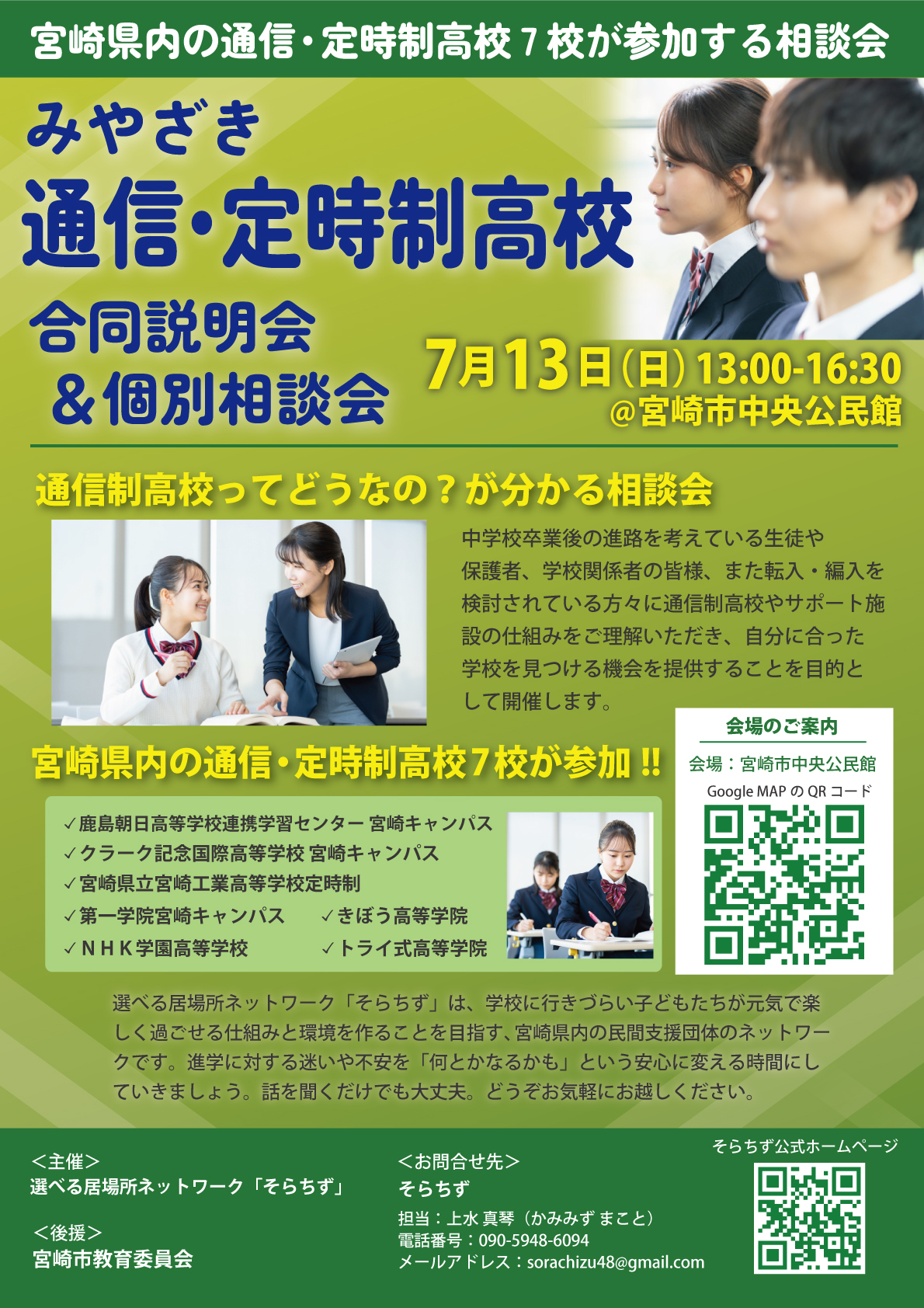 7/13開催_みやざき通信高校合同説明会の配布資料 2025.07.13 そらちず配布資料 表面最終-ダウンロード ■上記アンケートのURLはこちら↓https://docs.google.com/forms/d/e/1FAIpQLSf8Ebq2o72eyUYqiTT7yLed7FMmJNFFHkQrF60kPDjXCwNwXA/viewform?usp=header 【配布資料】参加校一覧最終ダウンロード